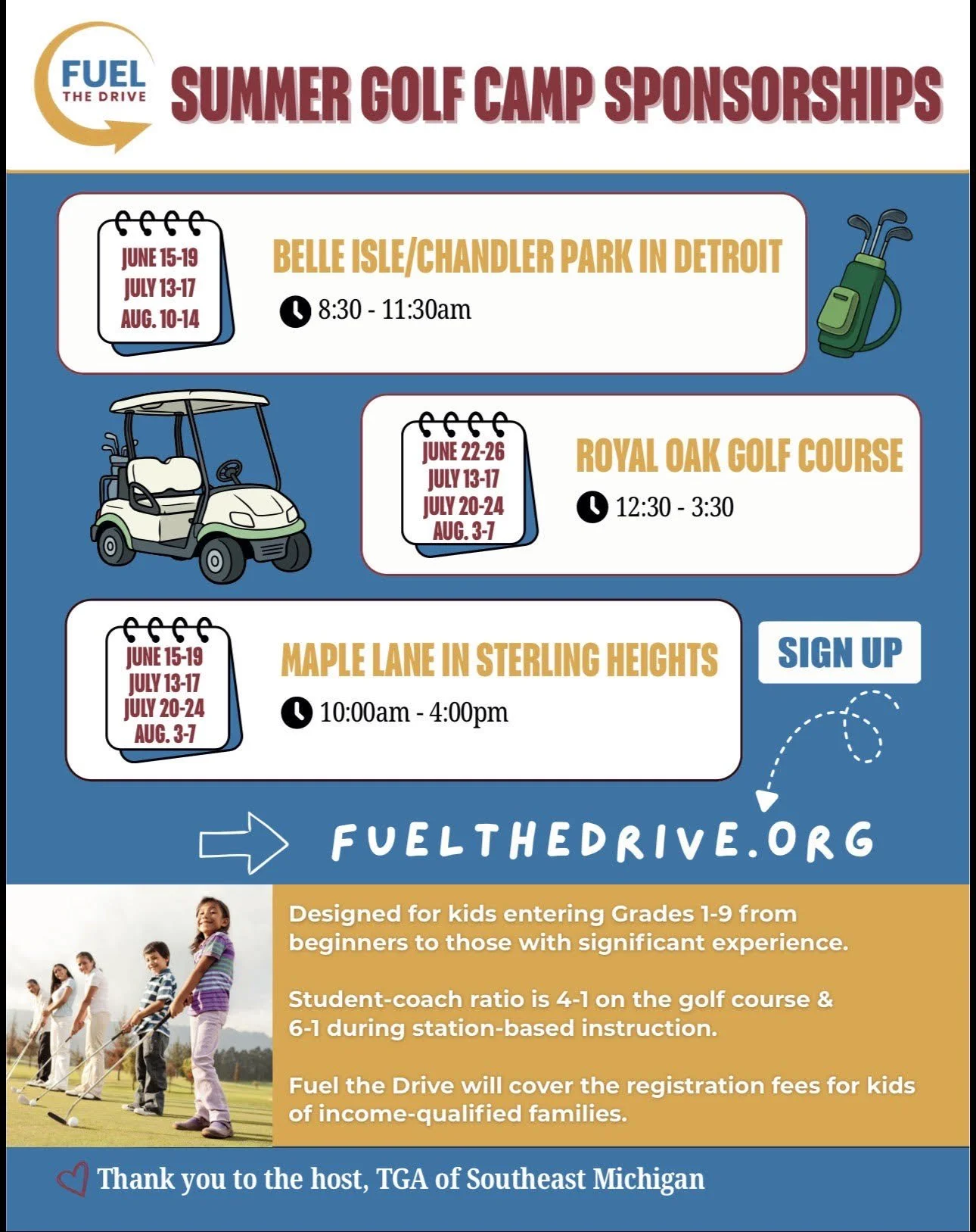 For children who qualify for a Fuel the Drive sponsorship, we’ll cover the cost of TGA of Southeast Michigan Summer Golf Camps and provide a set of golf clubs if needed.